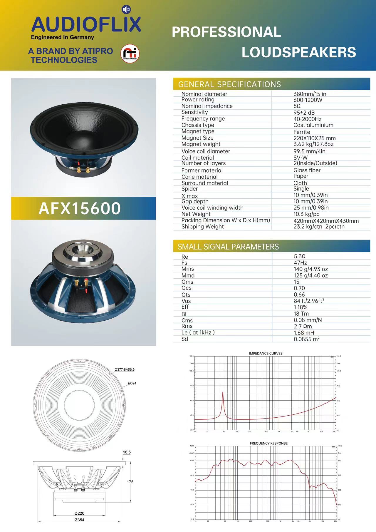 - The AFX15600 is a robust 15-inch ferrite DJ speaker engineered to deliver 600–1200 watts of peak power, making it an ideal choice for professional sound reinforcement applications.